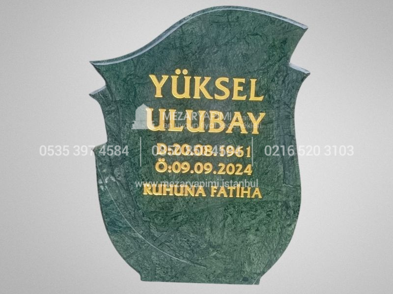 Görselde yer alan model, 6 cm kalınlığında Verde Guatemala granitten CNC teknolojisi ile özel olarak işlenmiş olup modern hatlara sahip baş taşı tasarımıyla üretilmiştir. Granit yüzey üzerine uygulanan sarı yaldız boya yazı tekniği, isim ve tarihlerin mezar taşı üzerinde net, okunaklı ve estetik şekilde görünmesini sağlar.
